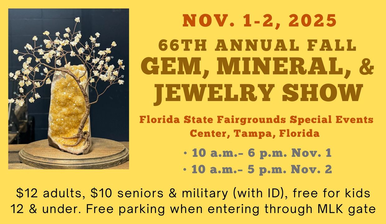 The Tampa Bay Mineral and Science Club presents its 66th Annual Fall Gem, Mineral, and Jewelry Show on November 1–2, 2025, at the Florida State Fairgrounds Special Events Center in Tampa. Explore over 55 vendors offering unique gems, minerals, beads, jewelry, and more. Enjoy family-friendly activities including a kids’ sluice, rock ID touch table, scavenger hunt, and kids' make-and-take jewelry classes. Show hours are Saturday 10 a.m.–6 p.m. and Sunday 10 a.m.–5 p.m. Admission is $12 for adults, $10 for seniors and military (with ID), and free for kids 12 and under. Free parking when entering from the MLK gate.